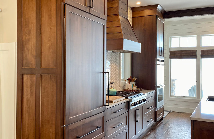 This elegant rustic kitchen features warm wood tones, elegant details, and wood cabinetry that create a cozy and inviting atmosphere. The dynamic quartz adds a touch of luxury, while the shiplap hood and herringbone backsplash add a modern twist to the rustic design.